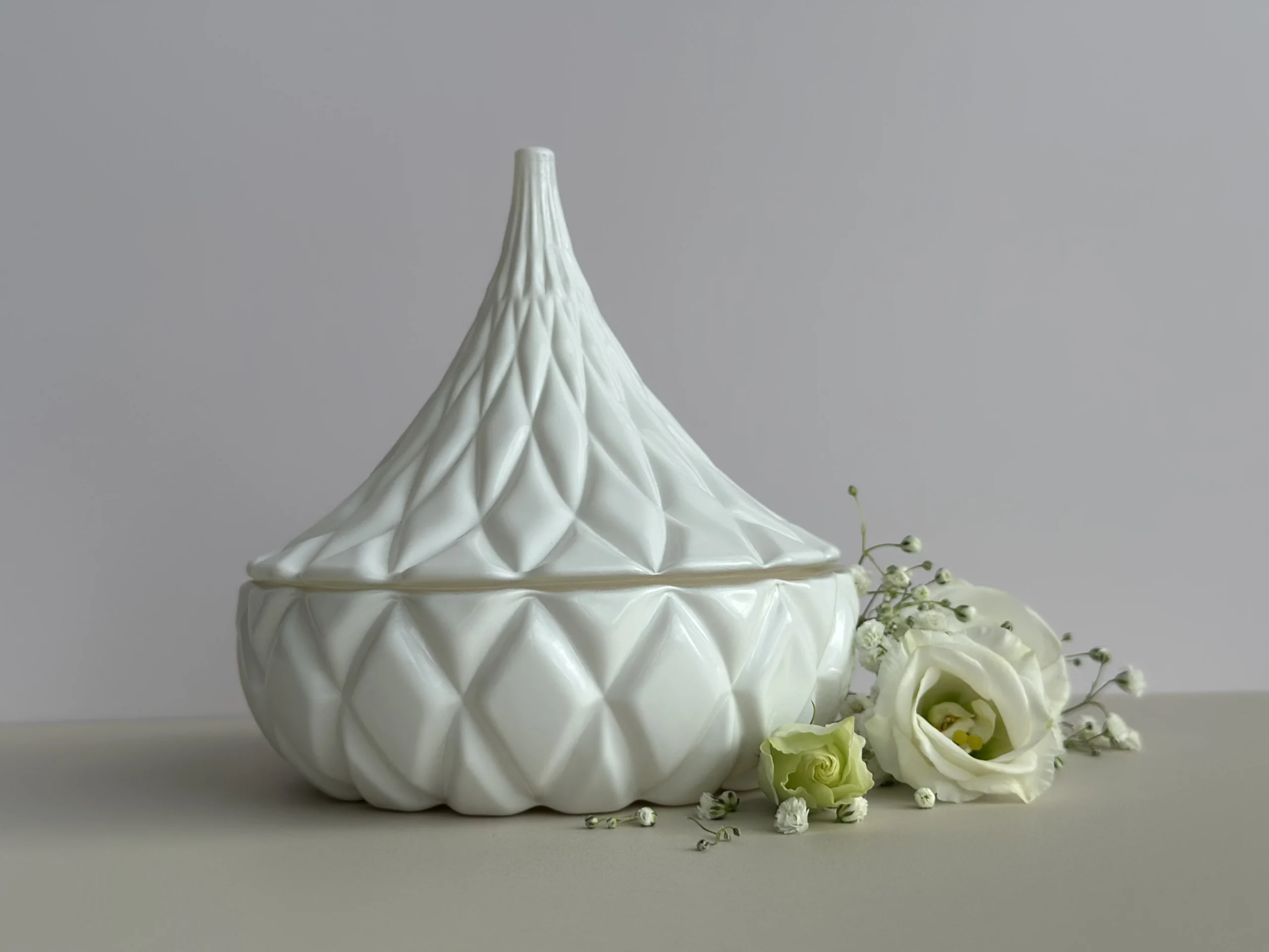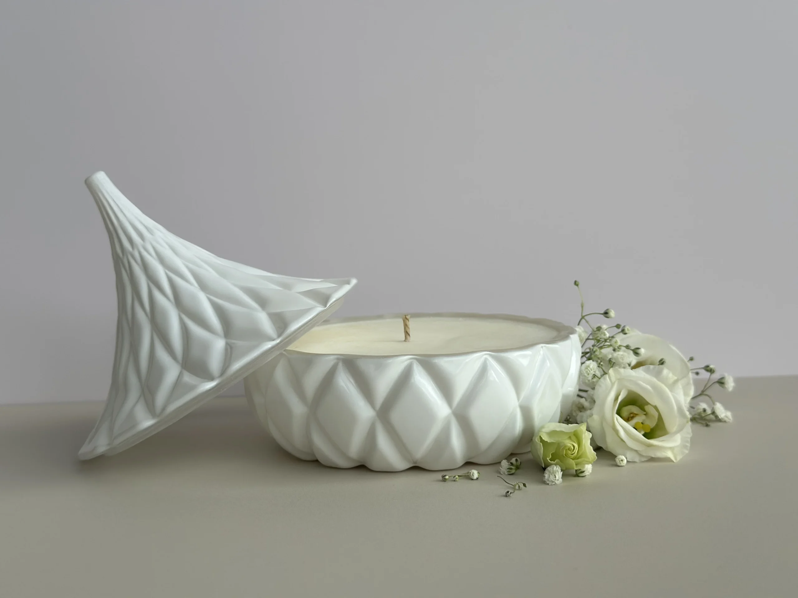 Encased in a beautifully crafted white jar with an intricate petal-inspired lid, this candle captures the delicate geometry of a blooming flower. Its soft ivory tone and sculptural form create a refined centrepiece that enhances both modern and classic interiors.